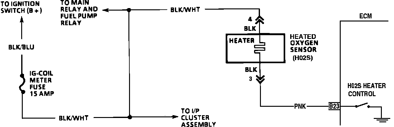 The Oxygen (HO2S) has a built in heater. This heater has battery voltage whenever the ignition switch is turned "ON." The heater causes the H02S to produce a signal to the ECM. This allows for better fuel control during engine warm-up. No codes can be set if the heater portion of the H02S fails. However, since it is part of the H02S, it is necessary to replace the entire sensor if the heater is found to be faulty.
