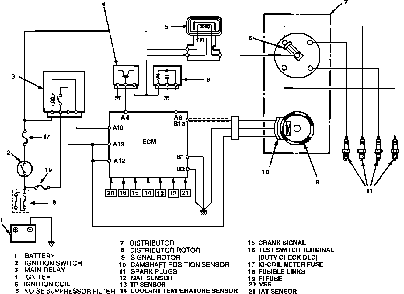 All spark timing changes in the distributor are performed electronically by the ECM. The ECM monitors information from various engine sensors, computes the desired spark timing and signals the distributor to change the timing accordingly. No vacuum or mechanical advance mechanisms are used on this system.