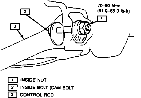The rear wheel toe is adjusted by the inner control arm cam bolt, Fig. 3. If toe is found to out of specification, loosen left and right inner control arm cam bolt nuts, then rotate cam bolts by equal amounts to correct toe setting. After completing adjustment, torque cam bolt nuts to 51 to 65 ft. lbs.
