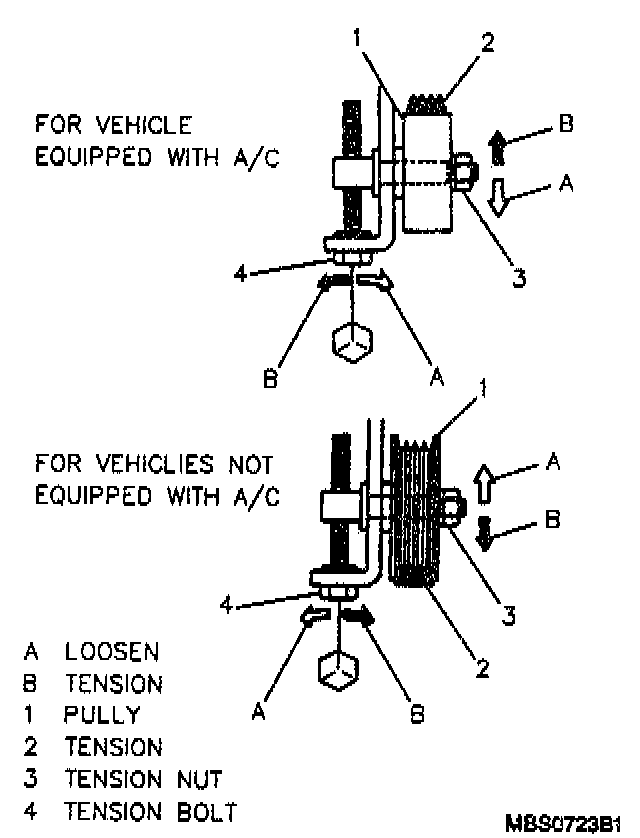 4. Loosen belt tension pulley retaining nut and tension bolt.