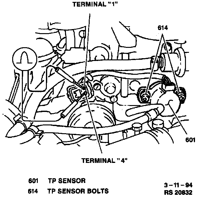 A. Connect a DVOM to TP sensor connector terminal "1" to "4" (TP sensor side). Measure resistance.