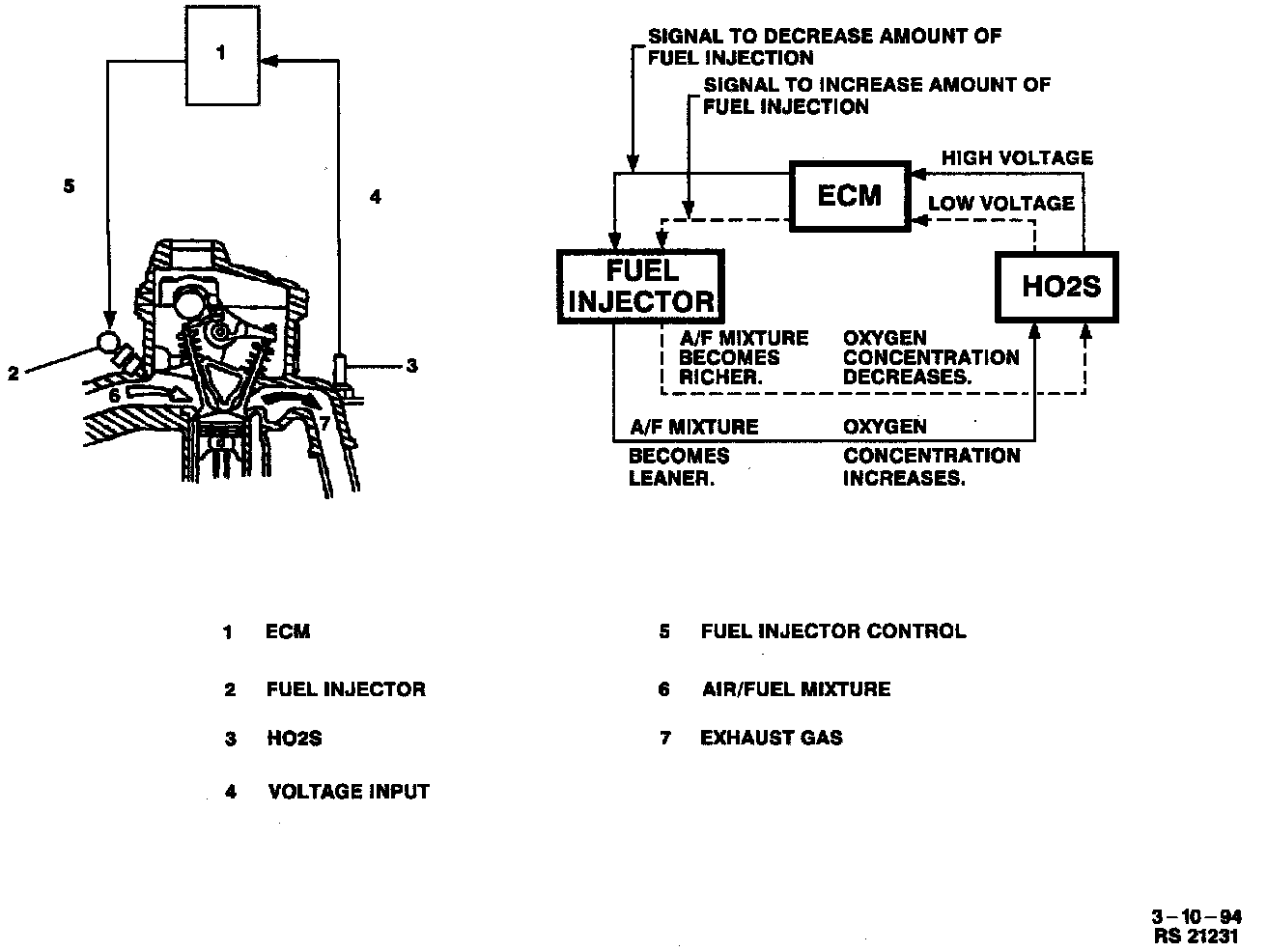 It is necessary to keep the air/fuel mixture close to the theoretical air/fuel ratio (14.7:1) to obtain efficient performance of the three way catalyst and high clarification rate of CO, HC and NOx in the exhaust gas. For that purpose, the Engine Control Module (ECM) operates as follows. First, it compares the input from the Heated Oxygen Sensor (HO2S) with a specified reference voltage, and if the input is higher, it detects that the air/fuel ratio is richer than the theoretical air/fuel ratio and reduces fuel. If the input is lower, it detects that the air/fuel ratio is leaner and increases fuel. By repeating these operations, it adjusts the air/fuel ratio closer to the theoretical air/fuel ratio.