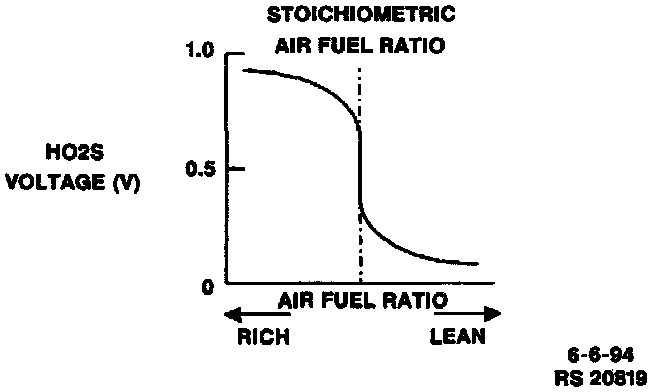 A large oxygen concentration difference results in about 1 volt and a small difference results in about 0.01 volt. To put it in other words, if the amount of oxygen in the exhaust gases is less (air-fuel mixture is richer than the stoichiometric mixture), about 1 volt is generated. If more (air-fuel mixture is leaner than stoichiometric mixture), almost none is generated (Refer to chart in accompanying image). In this way, the HO2S detects whether the oxygen concentration is high or low (or the mixture is leaner or richer than the stoichiometric mixture).