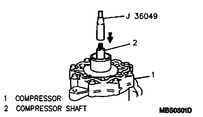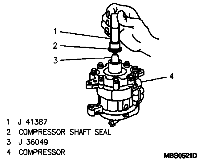 NOTICE: Do not use a press, hammer or other similar tool to press tool J 41387 with shaft seal into place. Damage to the compressor or compressor shaft seal may occur.