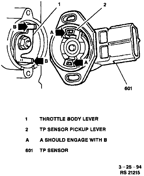 1. Align TP sensor onto throttle body so that sensor pickup lever can engage with throttle body lever; secure with two bolts. Do not tighten fully.