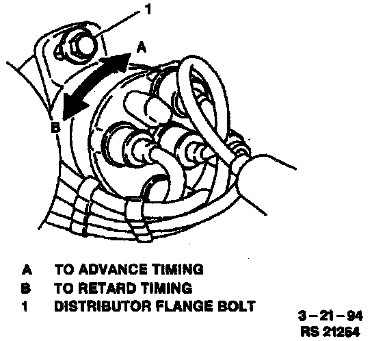 10. If not within specification, loosen distributor hold down bolt and rotate distributor and repeat until timing is within specifications.