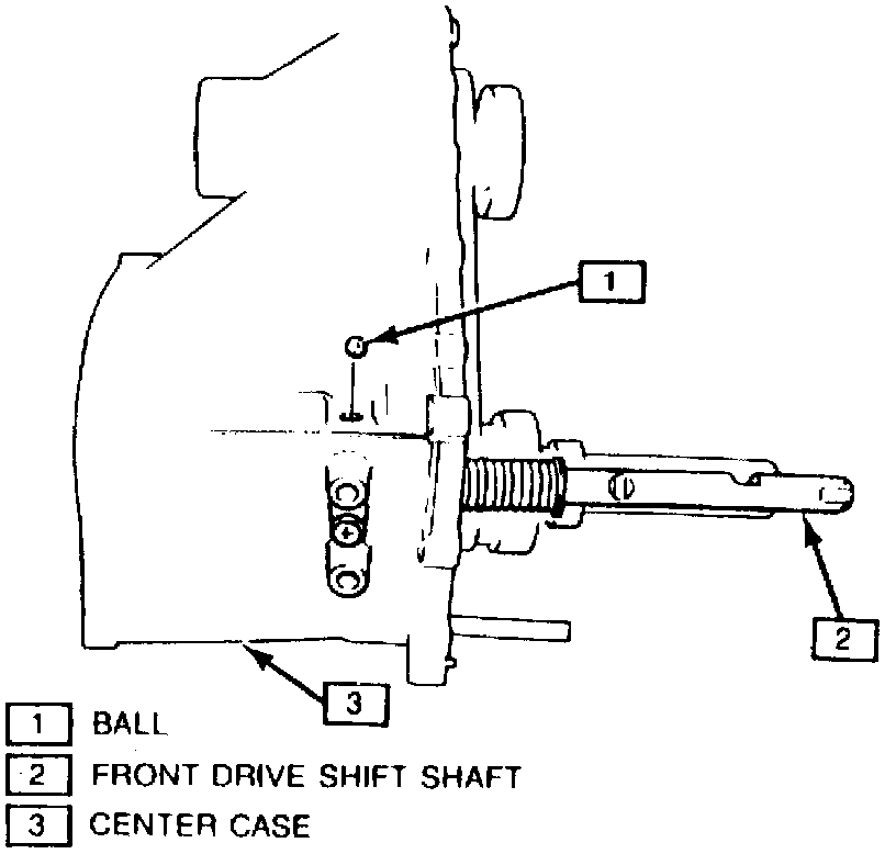 13. Install front drive fork shaft assembly, sleeve and hub in center case, then the locating ball, spring and bolt in case.