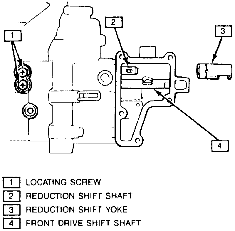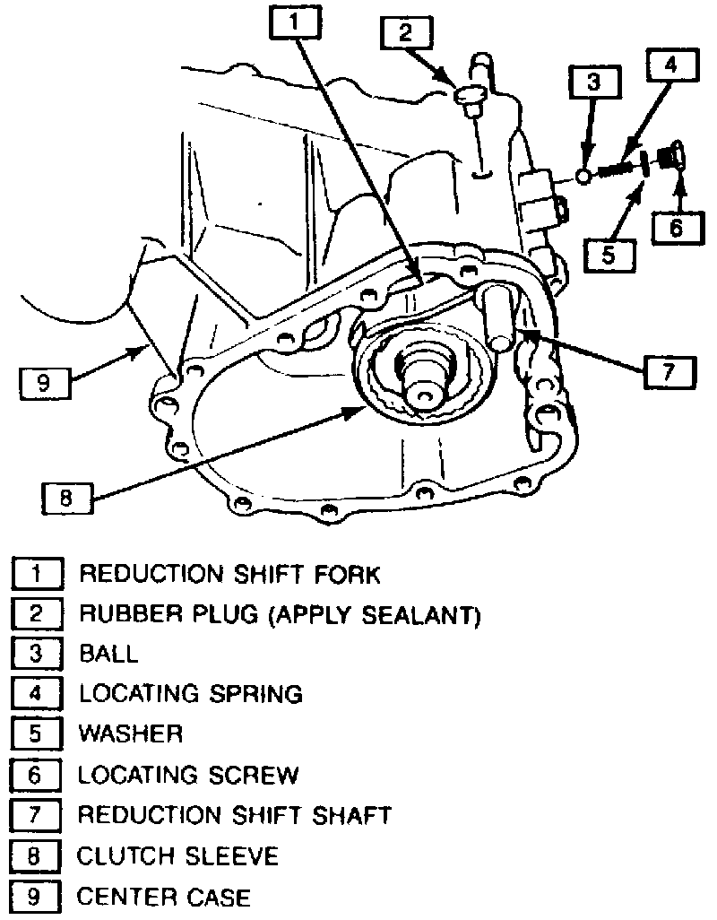 19. Install reduction clutch hub and sleeve with reduction shift shaft assembly into center case. When installing reduction shift shaft, front drive shift shaft must be in 4WD position.