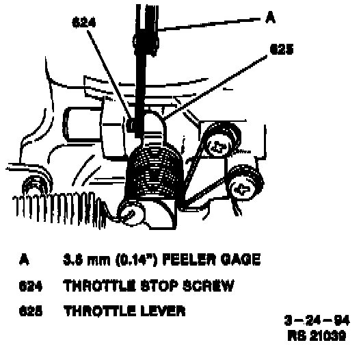 1. Insert a 3.5 mm (0.14 inch) feeler gage between throttle stop screw and throttle lever (refer to image).