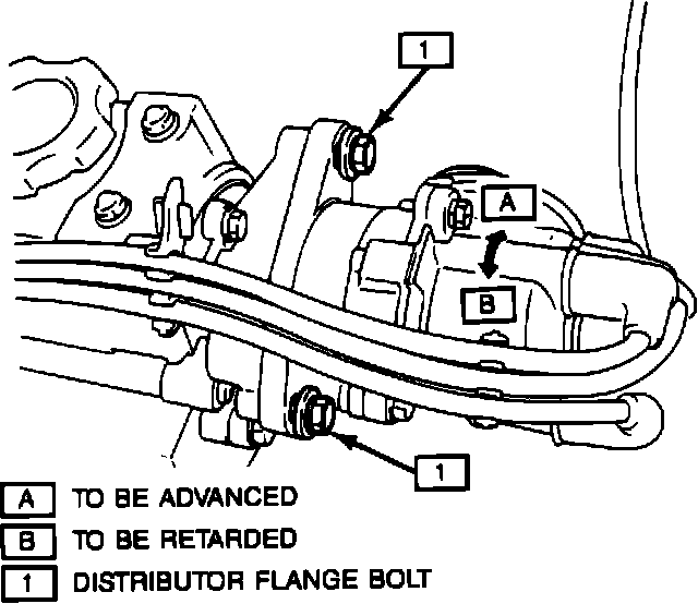 8. If not within specification, loosen distributor flange bolts and rotate distributor and repeat until timing is within specifications.
