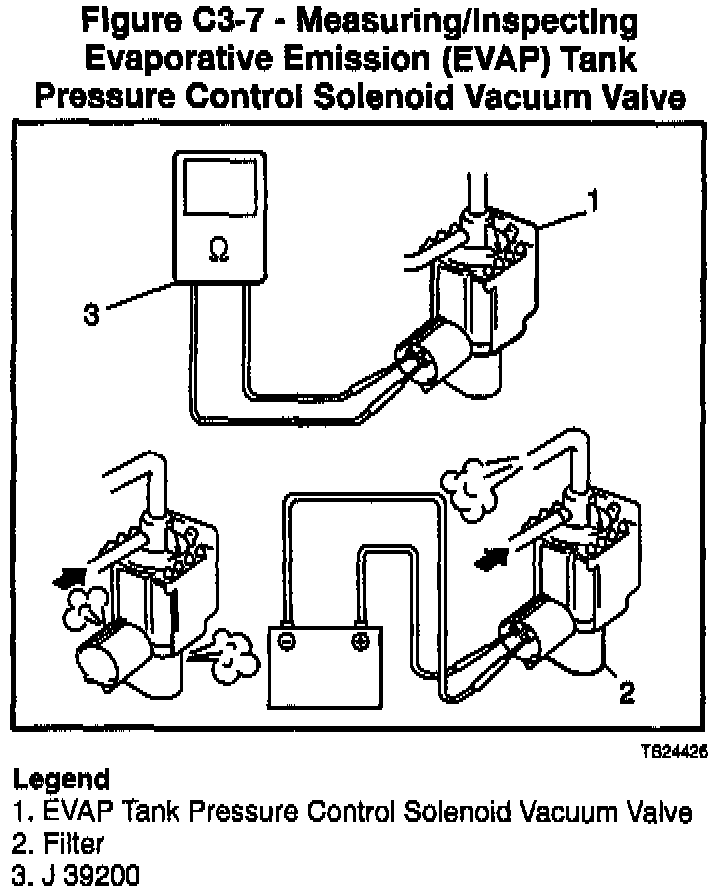 2. Using J 39200, measure resistance of the EVAP Tank Pressure Control Solenoid vacuum valve between both terminals. If resistance is not 33 to 39 ohms at 20°C (68°F), replace the EVAP Tank Pressure Control Solenoid vacuum valve. If the resistance is within specification, proceed with Step 3.
