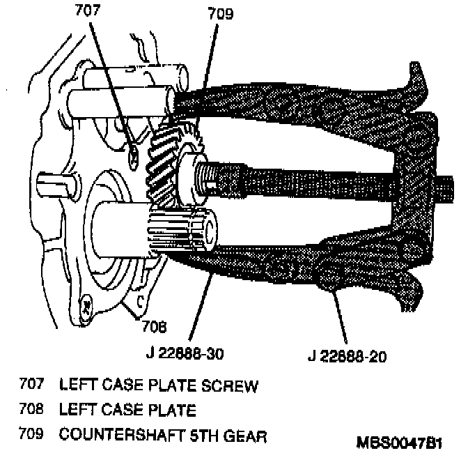10. 5th speed gearshift fork, 5th speed sleeve and hub, synchronizer ring spring, high speed synchronizer ring spring, 5th speed synchronizer ring, input shaft 5th gear and 5th gear bearing simultaneously from the input shaft using a J 22888-20 with two J 22888-30.