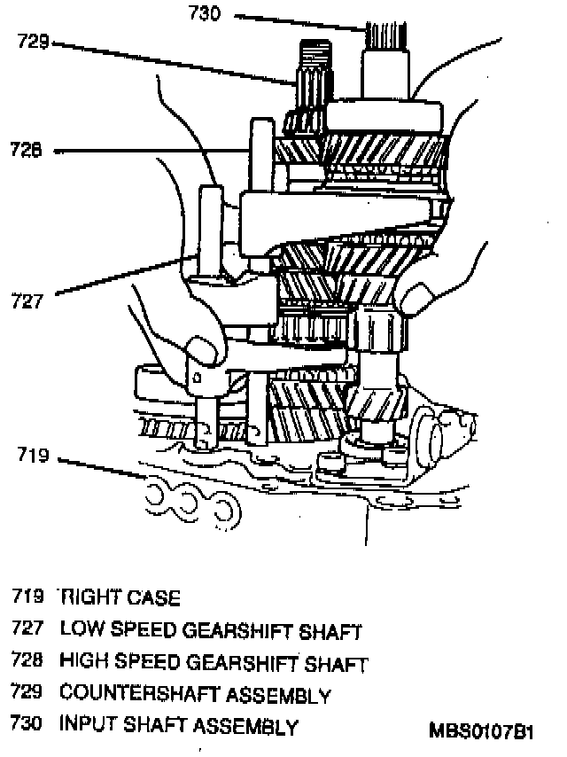 30. Input shaft assembly by tapping the input end with a plastic mallet and push the assembly out of the right case. Once the input shaft is free of the right case, remove the input shaft assembly, countershaft assembly, high speed and low speed gearshift shafts simultaneously as a cluster.