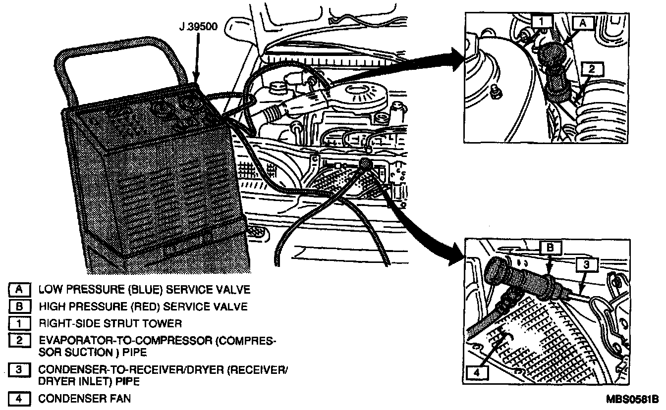 1. Connect the high side (red) and low side (blue) hoses to their respective service ports on the vehicle.