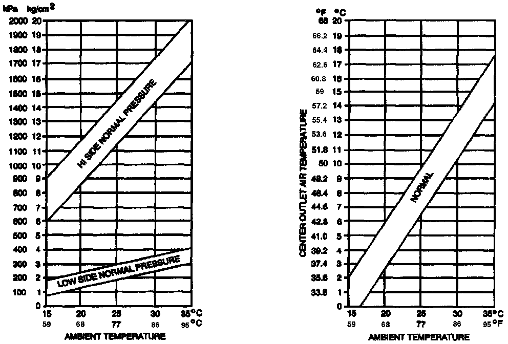 Compare recorded Hi and Low refrigerant system pressures and outlet air temperature with the graphs in Figure. If recorded values are not within specifications, refer to A/C System Refrigerant Diagnosis table for further diagnosis. System Diagnosis