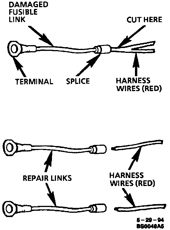 To replace a damaged fusible link, cut it off beyond the splice. Replace with a repair link. When connecting the repair link, strip wire and use staking-type pliers to crimp the splice securely in two places. For more details on splicing procedures, refer to "Typical Electrical Repair Procedures." Use crimp and seal splices whenever possible. Typical Electrical Repair Procedures