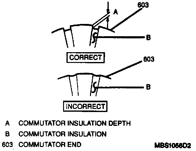 3. Commutator insulation depth. Standard commutator insulation depth is 0.4 to 0.6 mm (0.016 inch to 0.024 inch) (manual transaxle equipped vehicles) or 0.5 to 0.8 mm (0.020 inch to 0.031 inch) (automatic transaxle equipped vehicles). If insulation depth is less than 0.2 mm (0.008 inch), replace the armature.