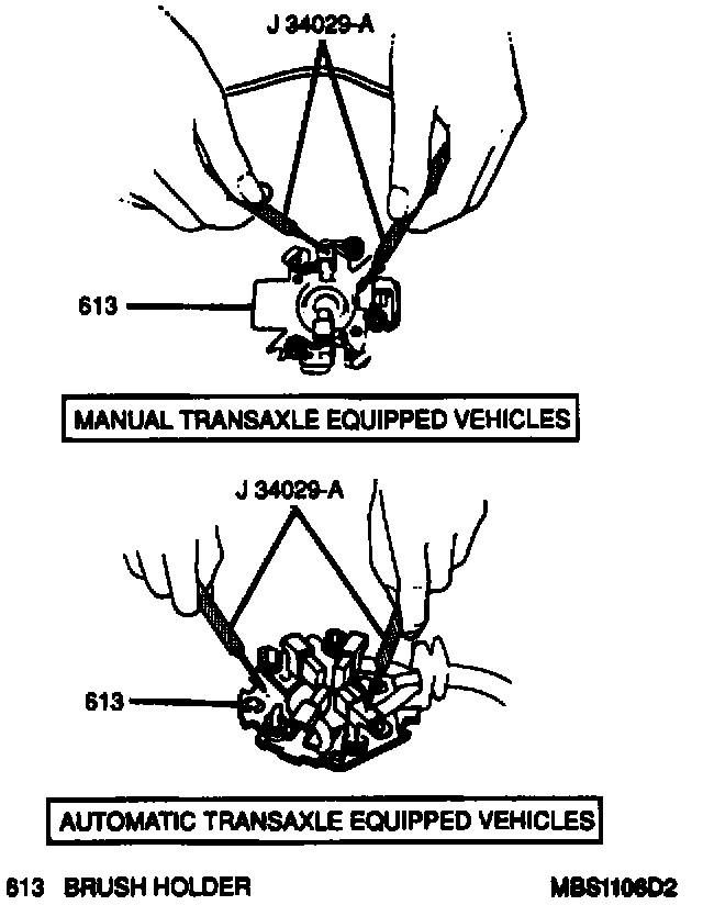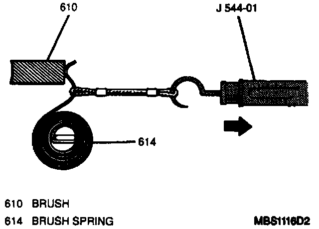 9. Brush spring tension using a J 544-01. Standard tension is 1.6 kg (3.53 lbs.) (manual transaxle equipped vehicles) or 2.1 kg (4.63 lbs.) (automatic transaxle equipped vehicles). If brush spring tension is less than 1.0 kg (2.20 lbs.) (manual transaxle equipped vehicles) or 0.7 kg (1.54 lbs.) (automatic transaxle equipped vehicles), the brush spring must be replaced.