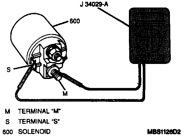 10. Solenoid pull-in coil resistance between terminal "S" and terminal "M" using the J 34029-A. If resistance is not 5 ohms or less, the pull-in coil is open and the solenoid must be replaced.