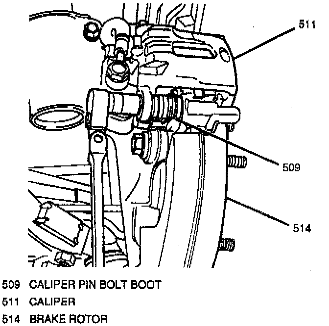 7. Caliper assembly from caliper carrier. Suspend caliper with wire to prevent damage to the brake hose.