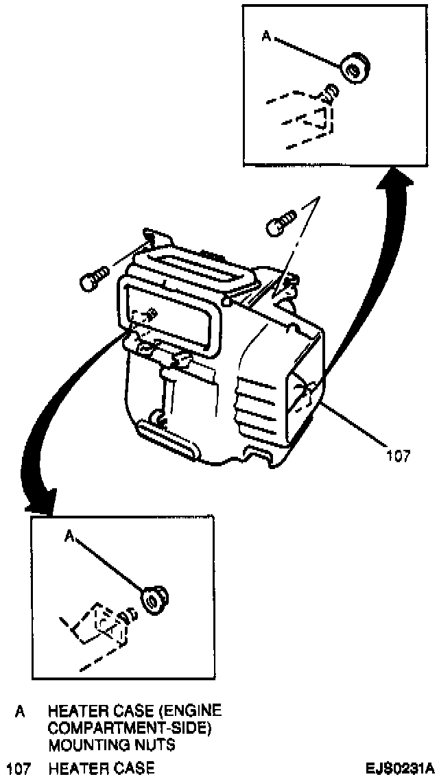 1. Heater case to vehicle; secure with two bolts and two nuts.