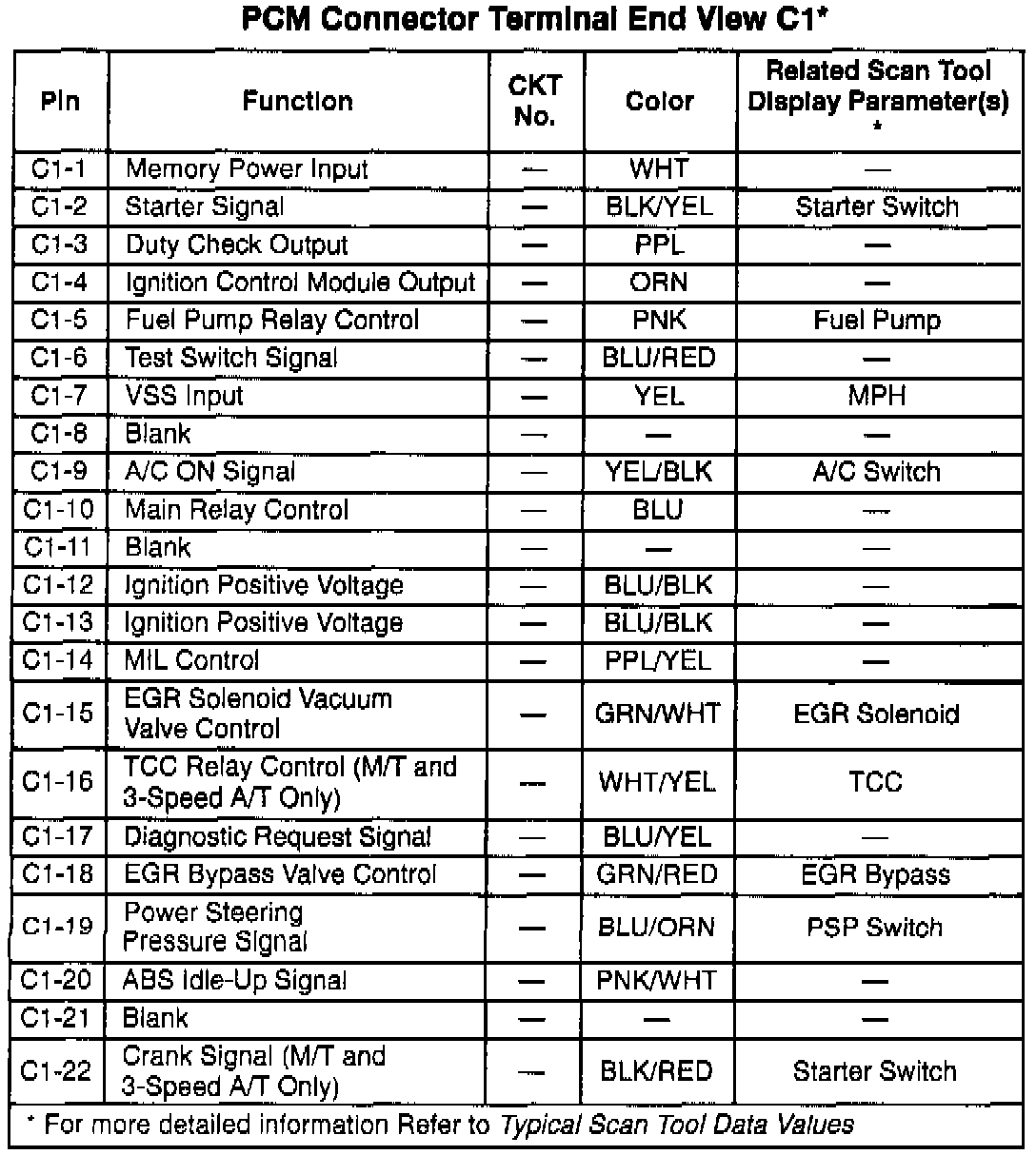 Pinout Values and Diagnostic Parameters