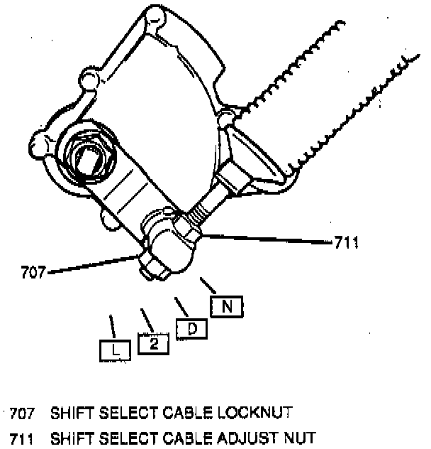 3. Shift select cable into manual shift lever while moving manual shift lever back to the "N" (neutral) position; secure with select cable locknut. Do not tighten fully.