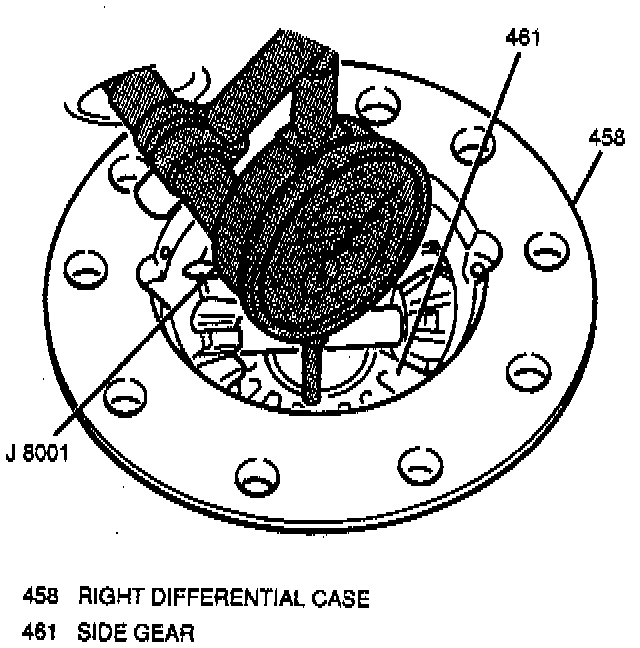 1. Left differential side gear end play using J 8001 and J 35138. Insert the J 35138 in through the left axle shaft differential case bore and adjust until the J 35138 has a firm grasp on the left differential side gear. Then, move J 35138 up and down while observing the J 8001. Left differential side gear end play should measure 12 to 37 mm (0.005 to 0.014 inch). If left differential side gear end play is too high or low, replace the selective shim with the appropriate size to obtain correct end play.