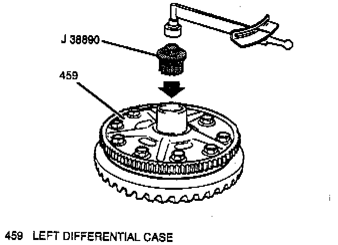 1. Rear wheel antilock (ABS) speed sensor exciter ring onto left differential case half using J 38891 exciter ring installer and J 8107-04. Place the exciter ring inside the J 38891 on a hydraulic press. Then, center the left differential case half in the exciter ring with J 8107-4 side in the left axle shaft bore and slowly press the left differential case half evenly into the exciter ring.
