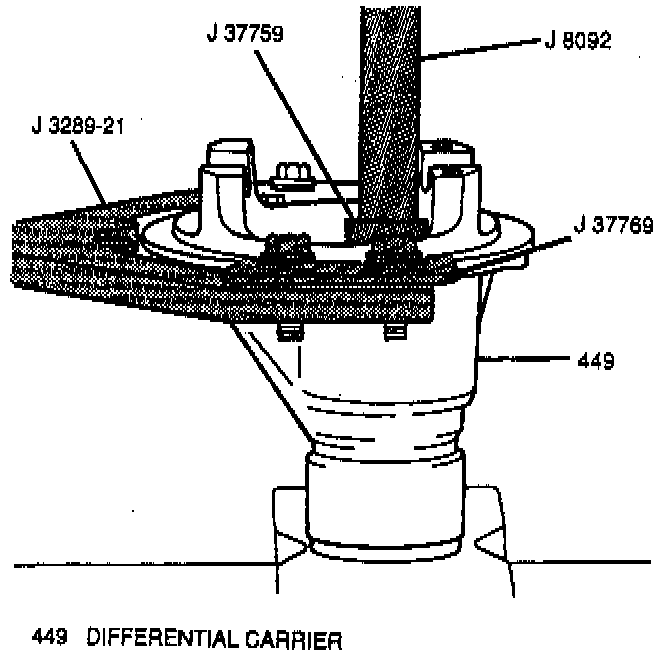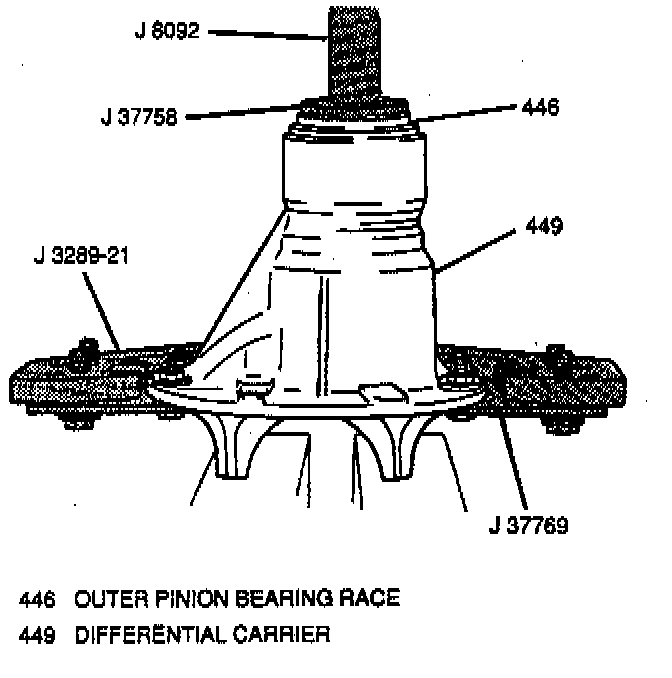 - Outer pinion bearing race using J 37758 with J 8092. Place the differential carrier on a hydraulic press and position the outer pinion bearing race over its bore. Then, using the J 37758 with the J 8092, slowly press the outer pinion bearing race evenly into the differential carrier.