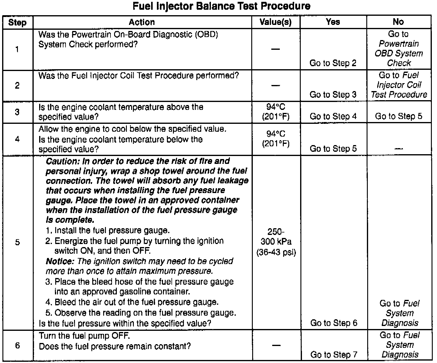 5. The fuel pressure should be within the specified range. If the fuel pressure is not within the specified range, go to Fuel System Diagnosis. Table A-7B Fuel System Diagnosis (Fuel Pressure Check)