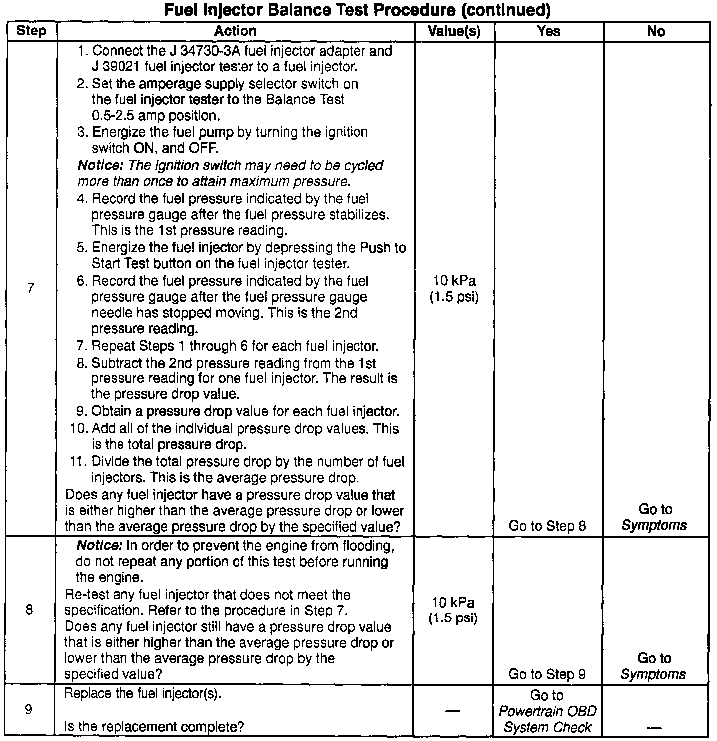 7. The fuel injectors are flowing properly if the pressure drop value for each fuel injector is within 10 kPa (1.5 psi) of the average pressure drop value. Calculate the pressure drop value for each fuel injector by subtracting the second pressure reading from the first pressure reading. Refer to the examples in the preceding table.