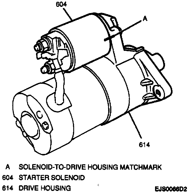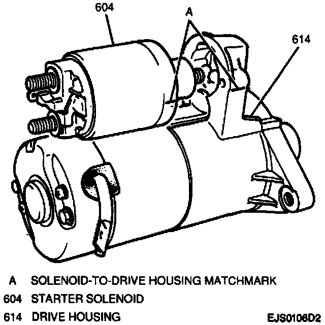 2. Solenoid to drive housing aligning solenoid-to-drive housing matchmarks; secure with two screws.