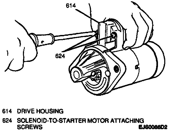 2. Two solenoid attaching screws and starter solenoid from drive housing.
