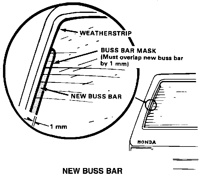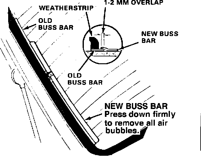 Install a new buss bar on each side of the rear window glass. If the window has been replaced, inspect the buss bars to make sure the window is the updated type: When viewed from the outside, the buss bars of the old style window are covered by the window weatherstripping; on the updated window, the buss bars are inboard of the weatherstripping and are completely visible.
