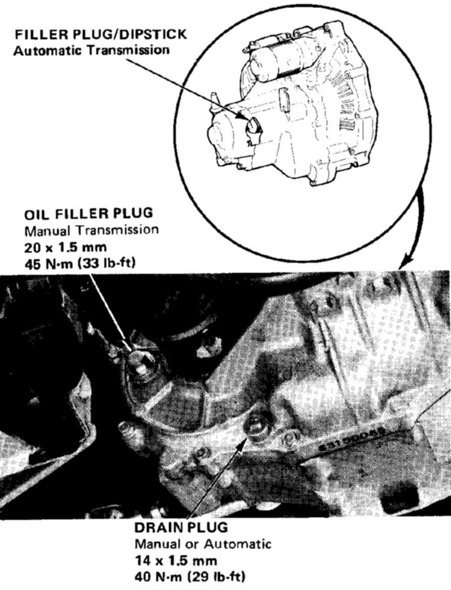 9. Drain transmission oil/fluid. Use a 3/8" drive socket wrench to remove drain plug. Remove oil filler plug to speed draining. Reinstall drain plug with new washer.