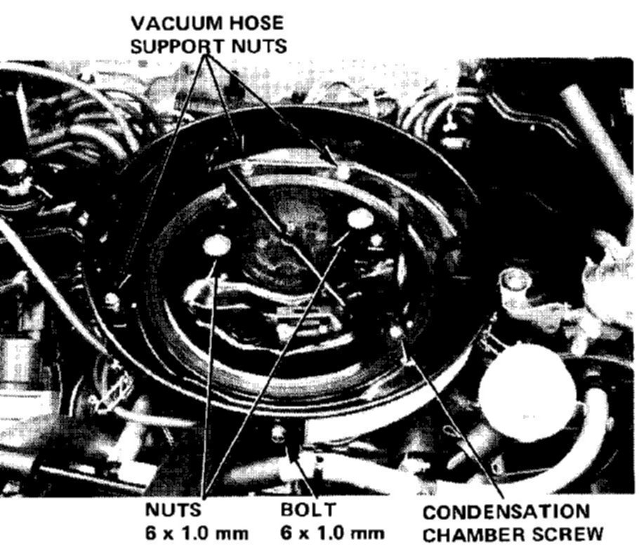 14. Remove the screw holding the condensation chamber. Remove the three nuts holding the vacuum hose supports. Remove the two nuts and one bolt holding the air cleaner.