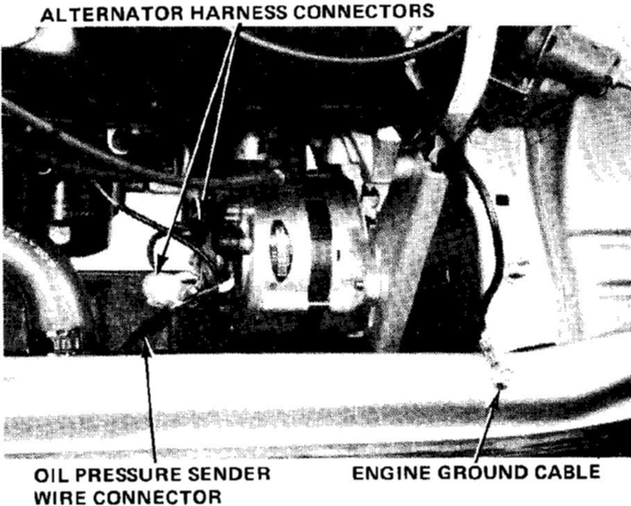 19. Disconnect the engine ground cable, oil pressure sender wire connector and alternator harness connectors. On cars with air conditioning, disconnect the compressor clutch wire connector.