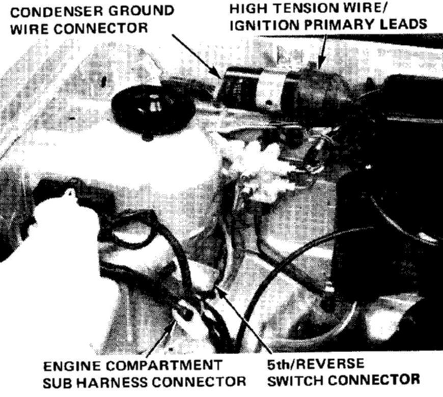 20. Disconnect the high tension wire and ignition primary leads at the ignition coil, and disconnect the condenser ground wire connector and engine compartment sub harness connector. On 1300 5-speed, disconnect the 5th/reverse switch connector.