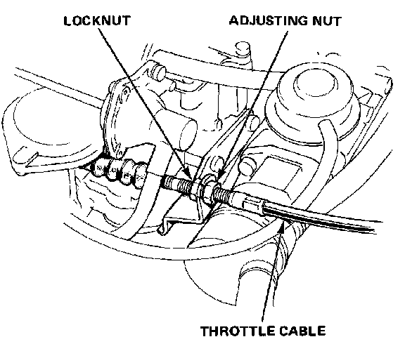 21. Remove the throttle cable by loosening the lock nut and throttle cable adjusting nut, then slip the cable end out of the throttle bracket and carburetor linkage.