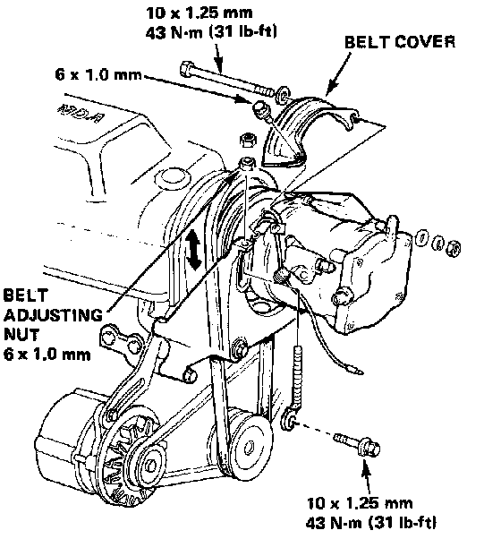 - Remove compressor belt cover, then loosen belt adjusting nut.
