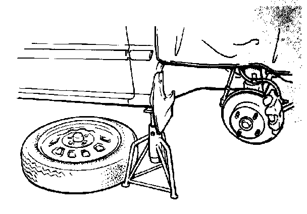 34. Loosen front wheel nuts slightly and jack up front of car. Place safety stands under frame at proper positions and remove front wheels. Apply parking brake and block rear wheels, so car will not roll off stands and while working under it.
