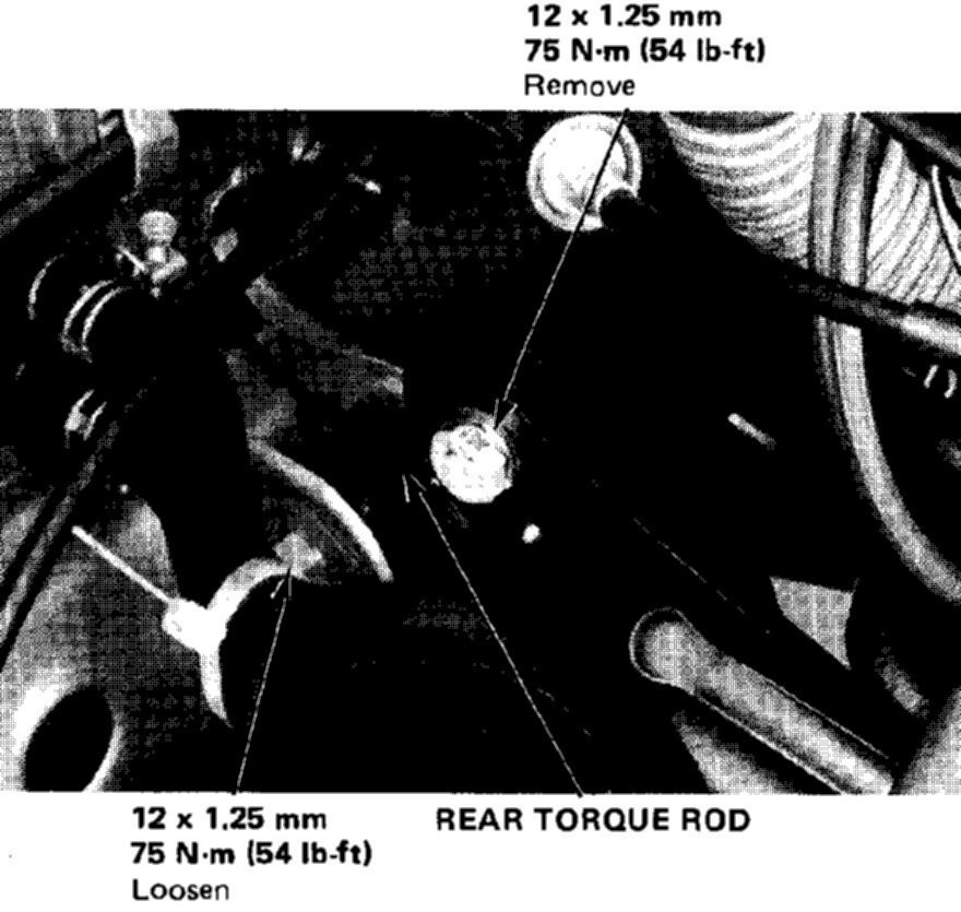 45. Remove bolt from rear torque rod at engine, then loosen bolt in frame mount and swing rod up out of the way.