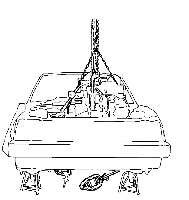 47. Slowly raise engine approximately 6" and stop. Check once again that all wires and hoses have been disconnected from engine/transaxle.