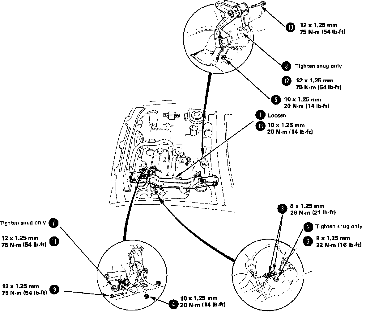 CAUTION: Failure to tighten bolts in proper sequence could cause excessive noise and vibration, and reduce bushing life; check that bushings are not twisted or offset.