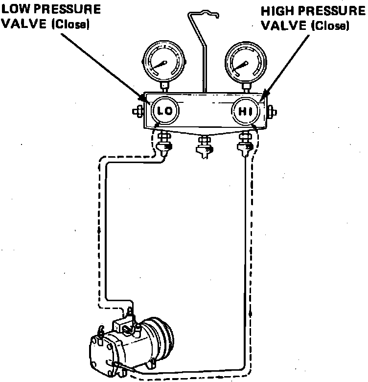 6. High pressure reading should be approximately 200 psi. Low pressure reading should be approximately 35 psi. If readings are incorrect, then refer to "SYSTEM PRESSURE DIAGNOSIS."