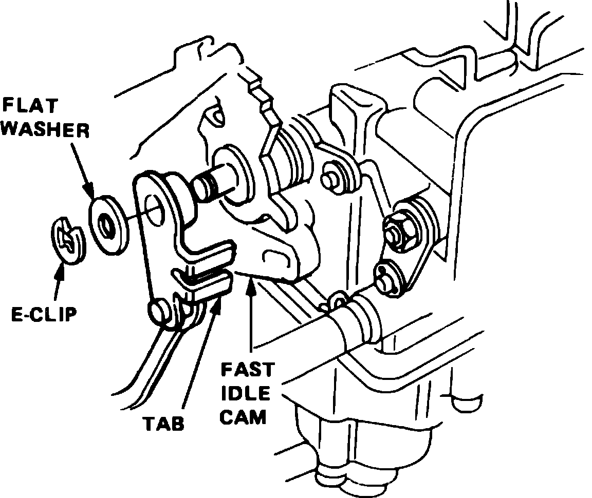 2. Remove E-clip and flat washer from thermowax linkage, then slide out linkage until its tab is clear of the fast idle cam, Fig. 4. Use care not to bend linkage or fast idle speed will be changed.