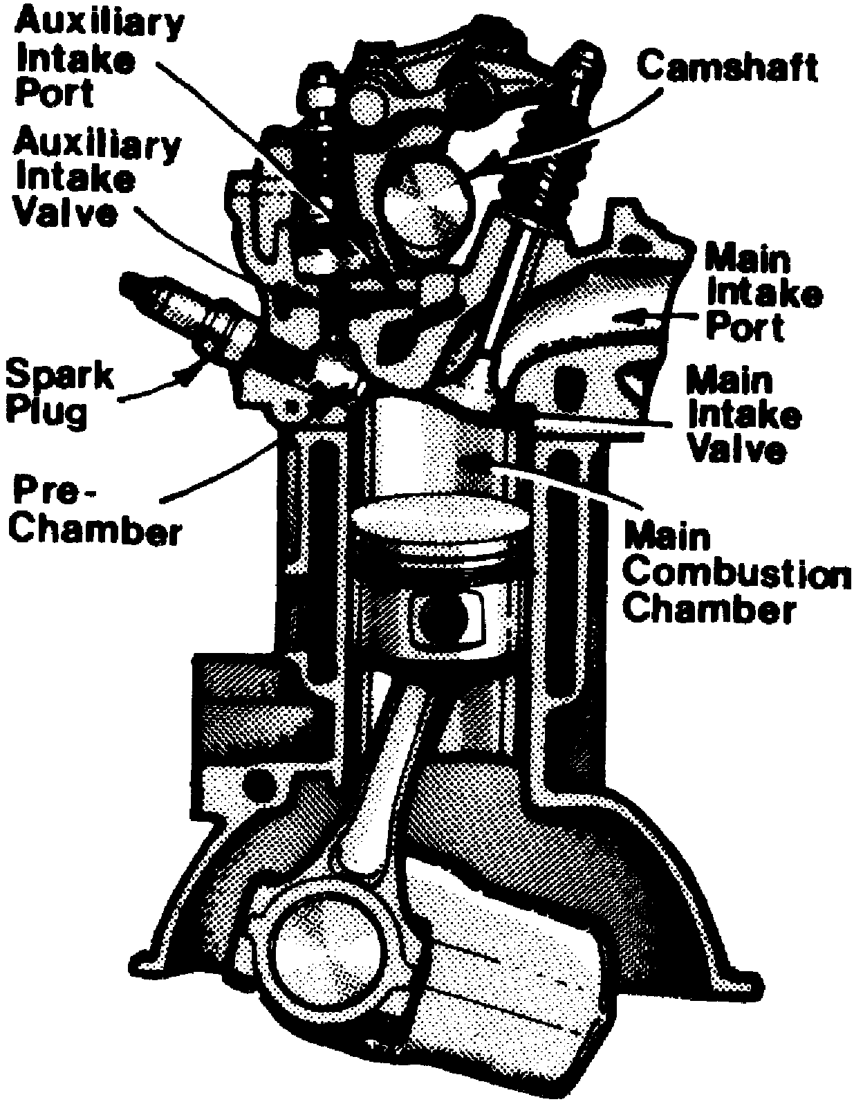 The basic principle of the CVCC is progressive ignition of a stratified charge in two chambers which are the main combustion chamber and auxiliary combustion chamber or pre-chamber. These chambers are joined to. ether by a small opening. The auxiliary combustion chamber uses a single small intake valve, and the main combustion chamber uses conventional intake and exhaust valves. All valves are actuated by a single overhead camshaft.