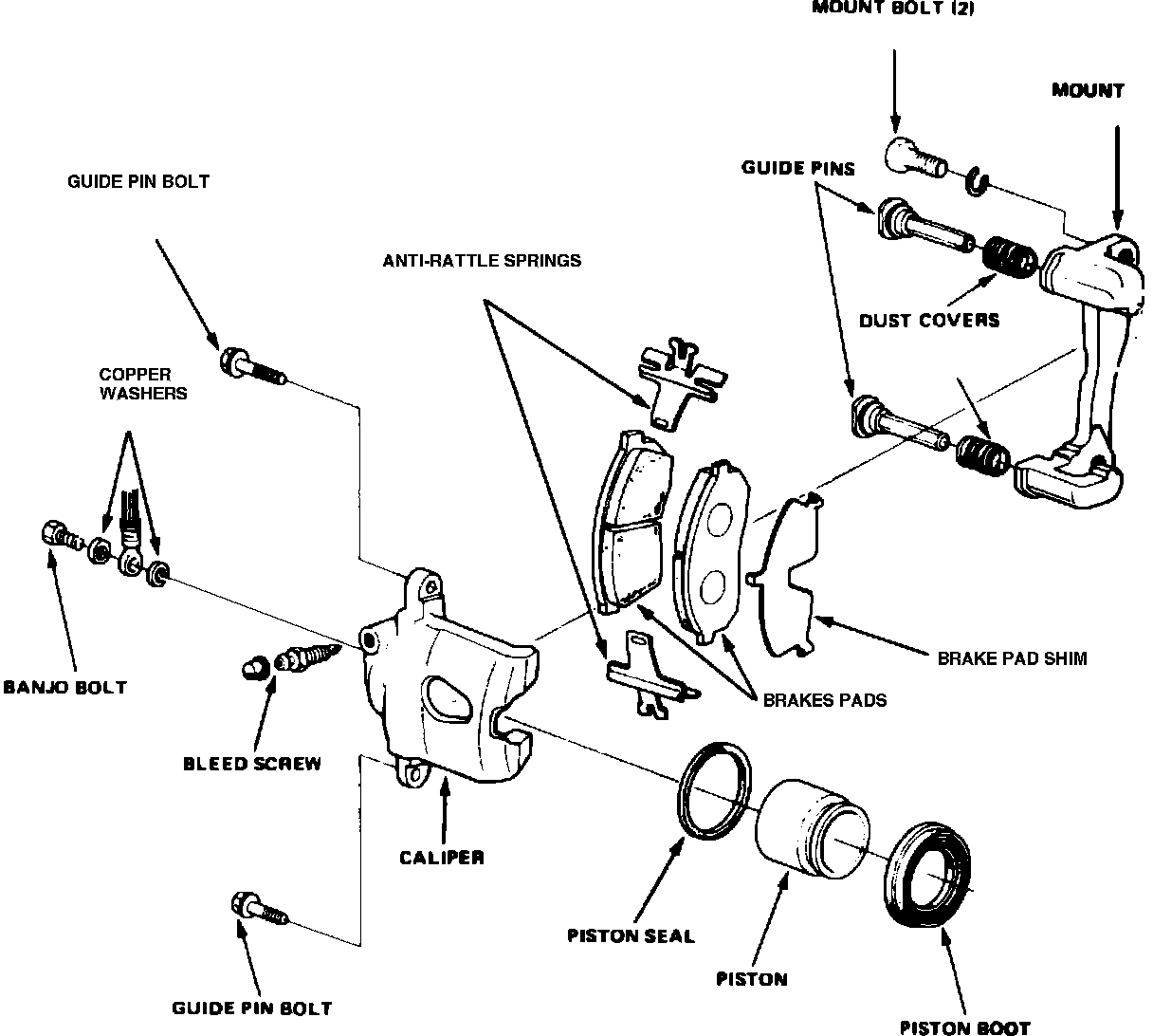 Fig. 4 Front disc brake caliper exploded view. 1984 Civic 1300 Coupe & 1985-88 CRX HF: