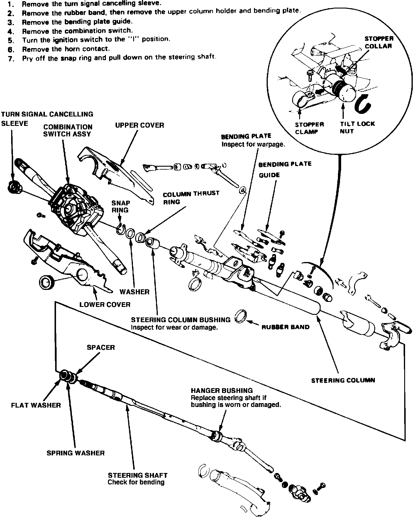Fig. 4 Tilt steering column exploded view. 1984-87 Civic & CRX w/manual steering (conventional column similar):